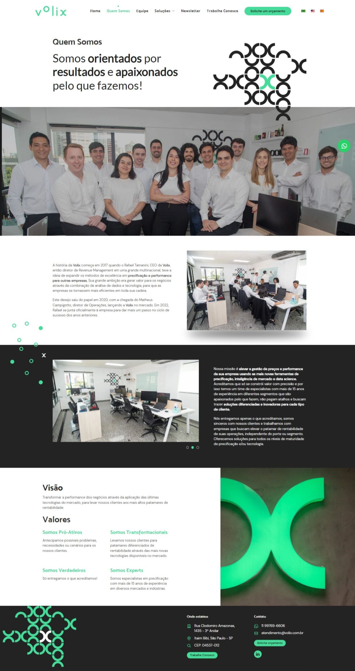 Desde 2017, a Volix se destaca no mercado ao oferecer soluções em precificação e performance para empresas, utilizando análise de dados e tecnologia como pilares para gerar valor aos negócios. O desafio na criação do site foi traduzir essa essência tecnológica e dinâmica em uma experiência visual moderna e funcional.
